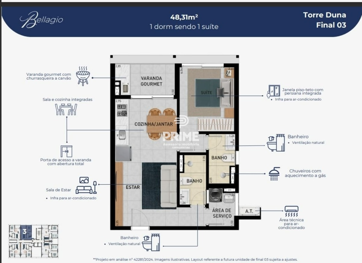 O apartamento conta com 1 dormitório, 1 suíte e 2 banheiros, proporcionando praticidade e privacidade.