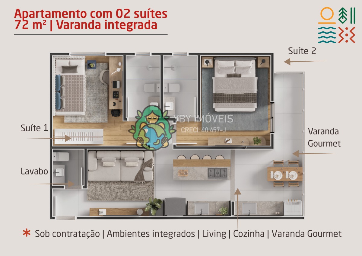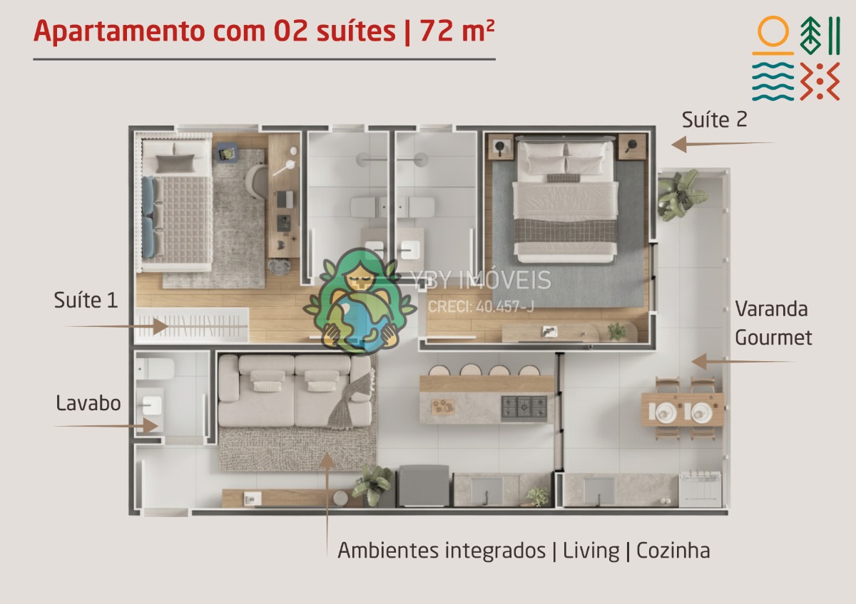 Apartamentos com 1, 2 e 3 suítes, de 53 m², 72 m² e 106 m²