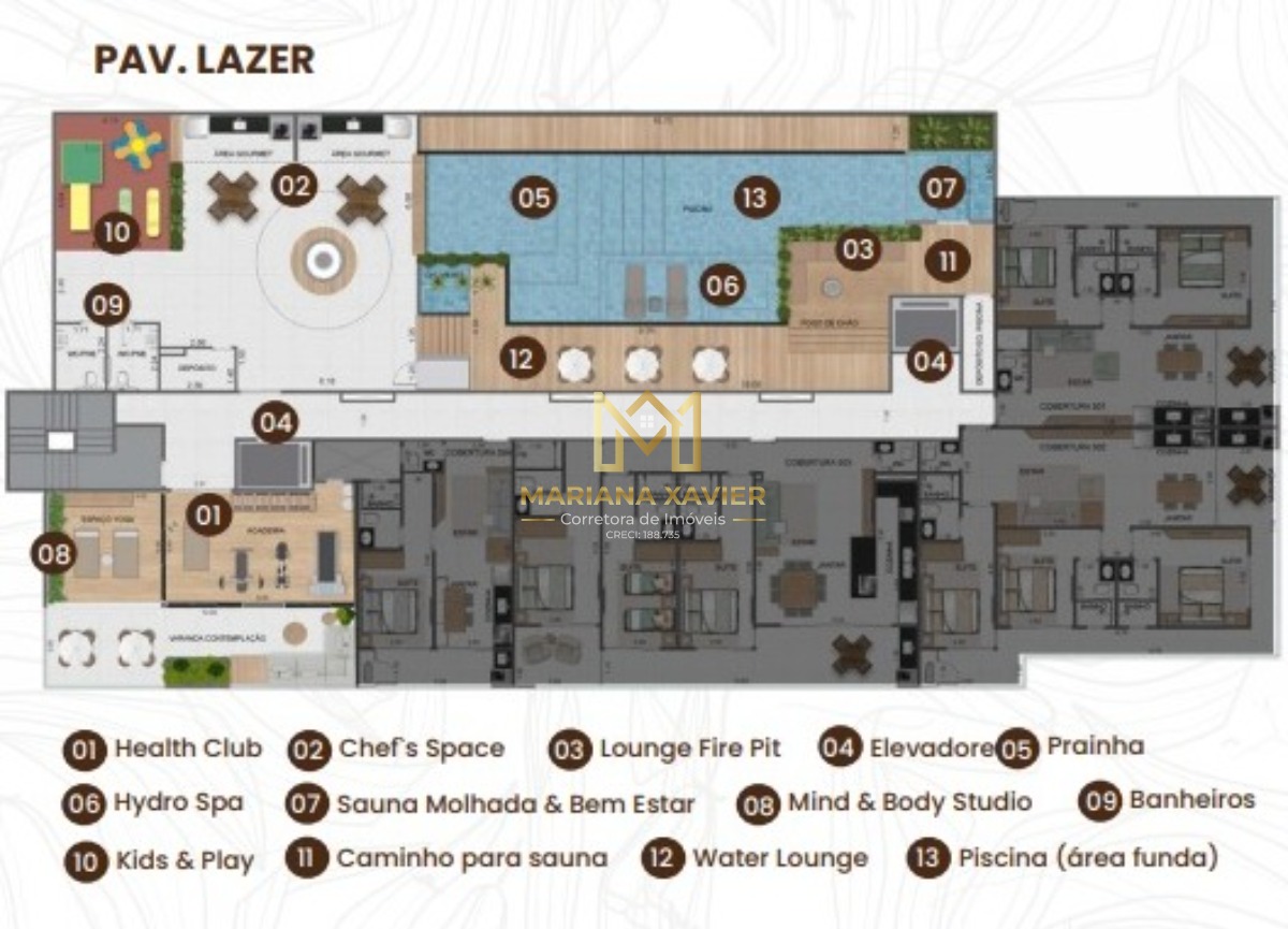 O projeto conta com 4 plantas, sendo lofts, 1 suíte, 2 dorms e 3 dorms. **Solicite valores e mais informações. Lazer completo com: Health Club Chef`s Space Lounge Fire Pit 2 Elevadores Prainha Hydro Spa Sauna Molhada & Bem Estar Mind & Body Studio Kids & Play Caminho para sauna Water Lounge Piscina (área funda)