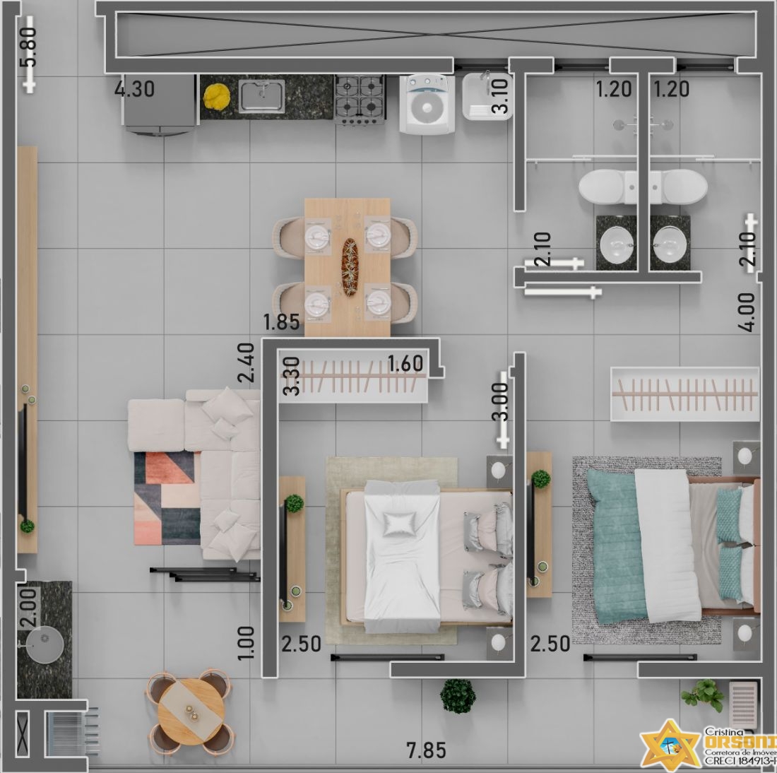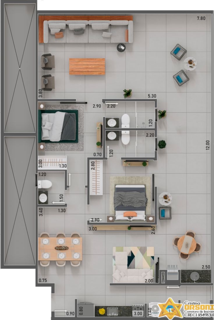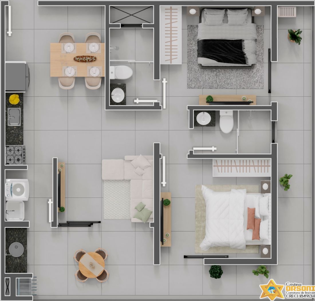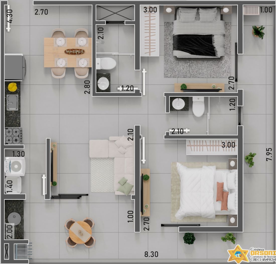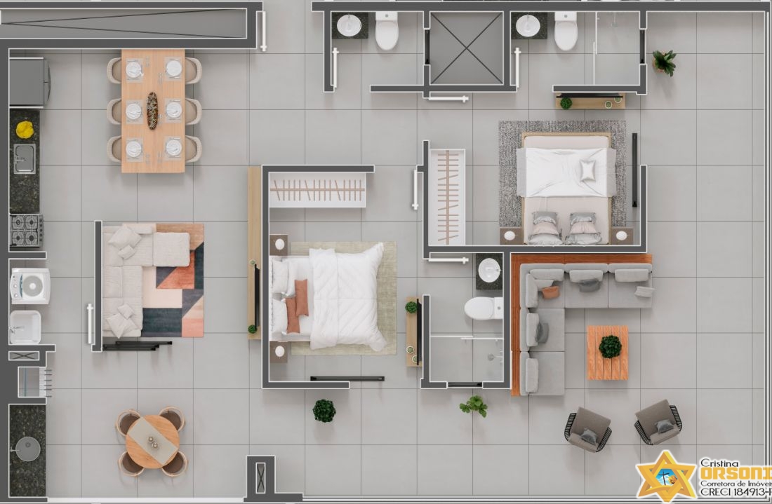 Possui 2 dormitórios sendo 2 suítes, 2 banheiros (sendo 2 das 2 suítes), 3 garagens.