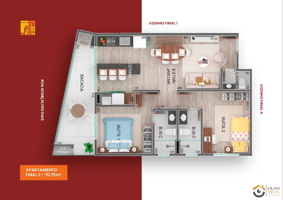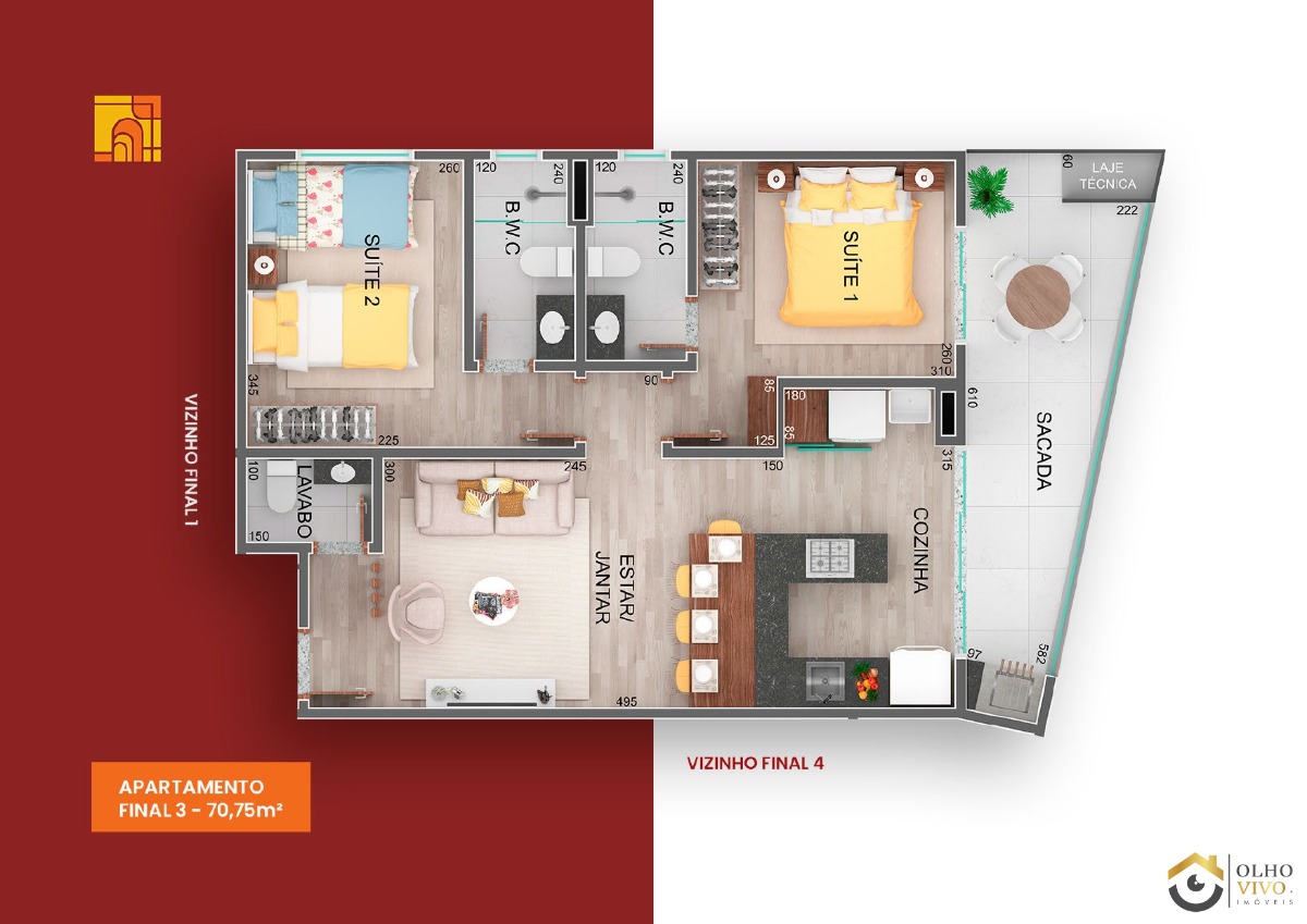 2 Dormitórios, 2 Suítes: Ambientes espaçosos e aconchegantes, garantindo privacidade e conforto.